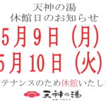 いつも高槻天然温泉 天神の湯をご利用頂きまして、誠にありがとうございます。 5月9日(月)、5月10日(火)はメンテナンス作業の為、休館日とさせて頂きます。 11日(水)は午前10時より営業致しますので、どうぞご利用下さ …